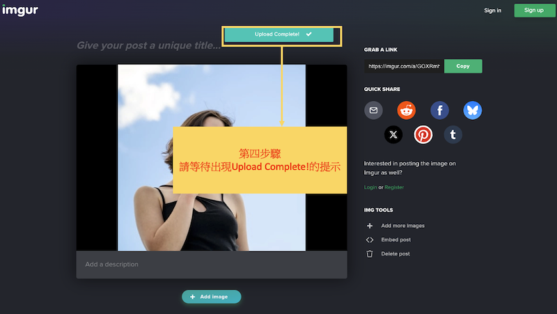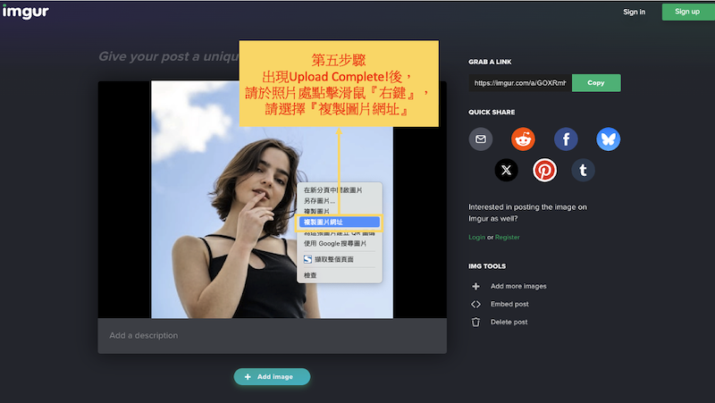 Step5.出現Upload Complete!後, 請於照片處點擊滑鼠『右鍵』, 請選擇『複製圖片網址』