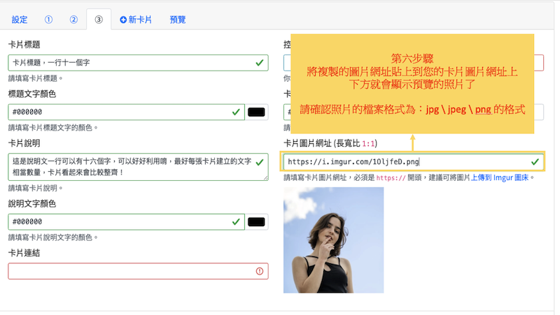 Step6.將複製的圖片網址貼上到您的卡片圖片網址上(請確認照片的檔案格式為:jpg \ jpeg \ png 的格式)